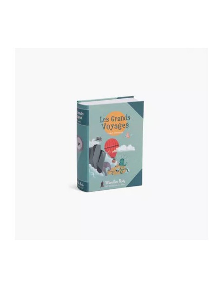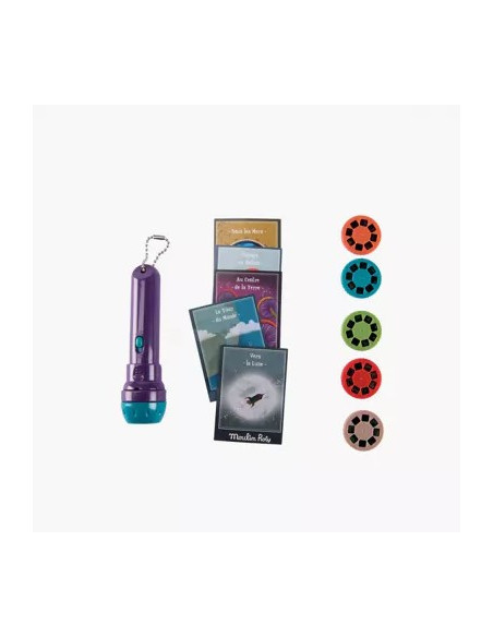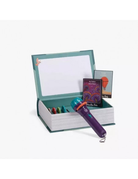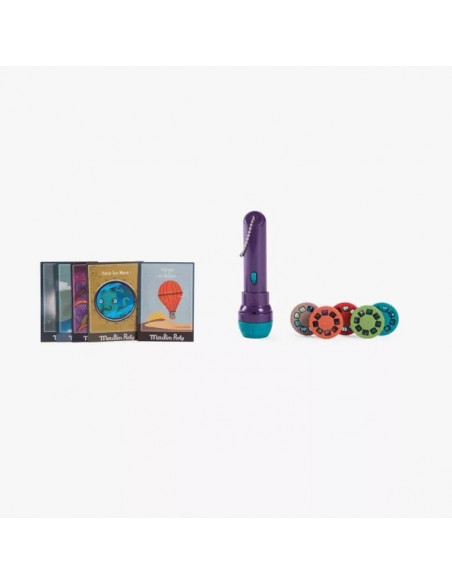 Ce coffret magnétique avec écran de projection est conçu comme un livre. Il contient 1 lampe à projeter, 5 disques sur l'univers des grands voyages et 5 petites cartes postales illustrées.