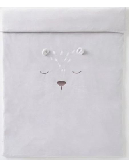 La housse de couette en Veloudoux gris clair de la collection Babou & Kendi brodée de la tête de Kendi tiendra votre enfant bien au chaud.