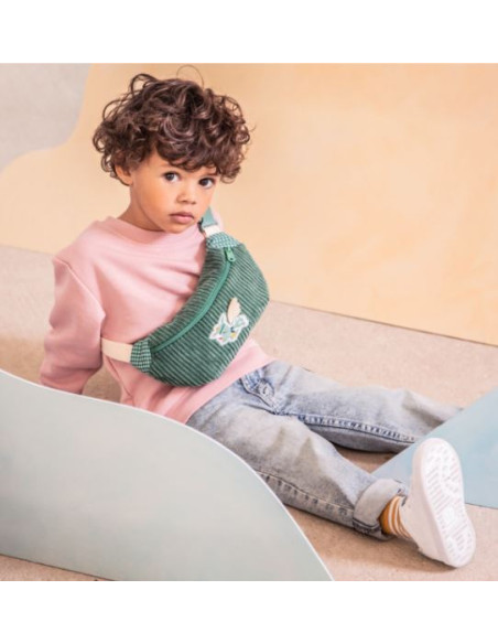 Ce sac banane tout doux, en velours côtelé, complètera les tenues de vos bouts de chou. Joe, branché avec ses ailes dorées, protège et veille aux trésors dans ce sac.