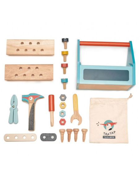 Boîte à outils en bois marqué d'un pivert avec tout ce qu'il faut pour construire quelque chose par soi-même.
