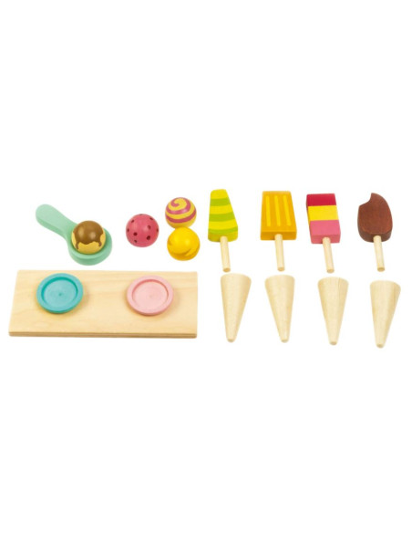 Chariot en bois à sur roues, avec 4 glaçons, 4 cornets, 4 boules de glaces colorées et aimantées, une cuillère à glace magnétique et un couvercle amovible révélant des pots.