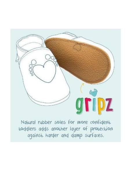 Chaussons fabriqués à partir de cuir souple avec semelle anti-déparapante en Hévéa pour faciliter l'apprentissage de la marche. Légers et flexibles aussi pour que les petits pieds puissent bouger librement sans restriction. Correspondent à la taille 22-23.