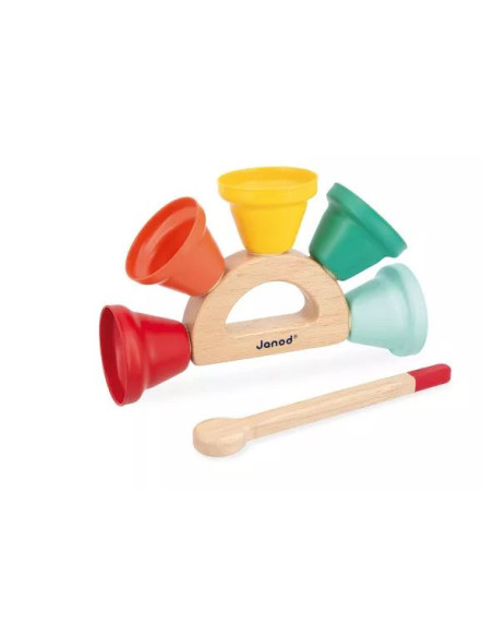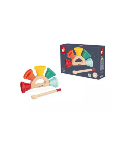 Faites résonner la joie ! Voici un jouet musical qui ravira les bébés dès 18 mois. Composé de 5 jolies clochettes en métal, fixées sur une poignée en bois, et d’une baguette pour les faire sonner, ce jouet d'éveil sonore est un véritable enchantement. Facile à prendre en main, ce jouet premier âge offre une initiation ludique aux sons. Les clochettes colorées stimulent l'acuité visuelle, leur son permet l’éveil musical et la manipulation de la baguette invite à la coordination des mouvements. Chaque clochette produit un son différent, permettant aux tout-petits de découvrir les nuances sonores et de développer leur oreille musicale. Avec ce jouet premier âge, les bébés peuvent créer leur propre concert à la maison ! Ils s’amuseront à faire sonner les clochettes, réagiront aux différentes sonorités et partageront des moments musicaux avec toute la famille. Ce jouet instrument de musique fait partie de notre gamme Gioia, une invitation à l’éveil musical dans la joie, permettant aux tout-petits de découvrir le monde des sons de manière ludique et sous le signe du partage. Jouet en bois certifié FSC™.
