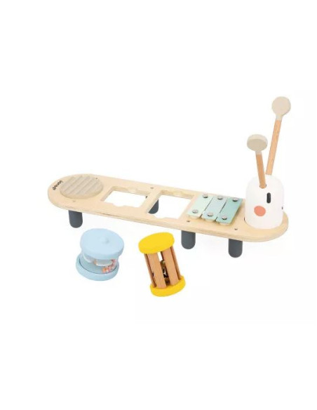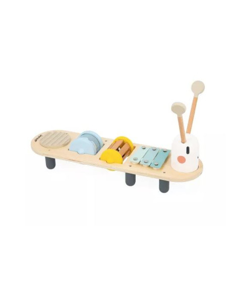 Il y a une maracas pour ajouter du rythme, un xylophone pour jouer des mélodies, un grelot pour une touche de douceur, un bâton de pluie pour imiter le son apaisant de la pluie et un gratte-gratte pour une texture sonore unique. Pratiques et bien pensées, les baguettes se rangent dans la tête de la chenille, assurant ainsi qu’aucune ne se perde.