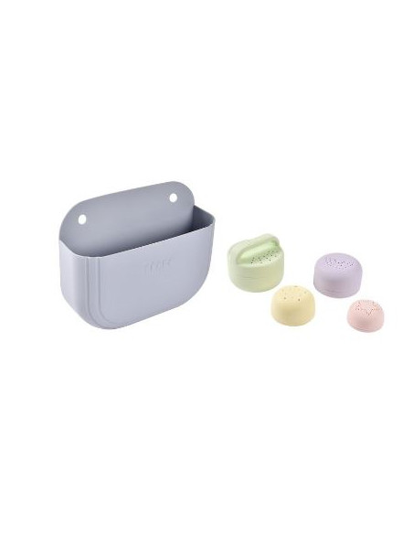 Coffret de bain en silicone comprenant 4 jouets de bain et son panier de rangement.