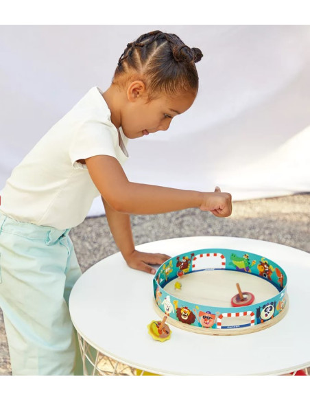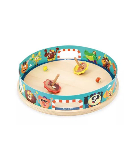 La foule est en délire quand les toupies entrent dans l'arène ! Dès ses 4 ans, votre enfant sera peut-être le maître de l’arène, contrôlant habilement sa toupie pour accomplir une mission : mettre la bille dans la cage adverse. Ce jeu de toupies en bois comprend 1 arène, 2 toupies avec lanceurs, et 2 billes de verre. Chaque toupie, équipée de silicone pour un rebond optimal, est un adversaire courageux qui tourbillonne à travers l’arène, visant les cages avec précision. Les billes de verre sont les trophées convoités que chaque toupie s’efforce de capturer. L’arène ainsi que sa foule en délire, est le stade où ces toupies s’affrontent. C’est un lieu de défis, de triomphes et parfois de défaites, mais toujours de plaisir et d’excitation. Ce jeu offre à votre enfant la chance de développer des compétences importantes comme l’adresse et la coordination main-œil, tout en s’amusant énormément. Que ce soit pour une fête, une réunion de famille ou simplement pour passer un après-midi amusant à la maison, ce jeu de toupie est le choix parfait. Préparez-vous, car dans l’arène des toupies, chaque partie a son lot de rebondissements ! Cette arène et toupies en bois s’inscrivent dans la collection fun et décalée qu’est la gamme APPLEPOP. Ce jeu de toupies est fabriqué dans un bois certifié FSC™.