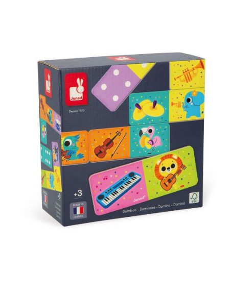 La musique s’est emparée de nos petits amis de la jungle ! Jouez en famille à ce jeu de dominos de 28 pièces conçu pour amuser les enfants dès 3 ans dans un univers de fête et de découverte. Chaque pièce présente l'illustration d’un instrument de musique et d’un animal en pleine performance. Les enfants sont ainsi initiés aux différents instruments de musique tout en découvrant les animaux de la jungle. Simplement, le but est de relier chaque instrument de musique à son petit musicien, présent sur une autre pièce. Les dominos sont double-faces et présentent aussi les constellations d'un dé, pour jouer à la version plus traditionnelle du jeu. Les grosses pièces adaptées aux petites mains permettent ainsi de développer la motricité fine des enfants. Au fur et à mesure que les bambins alignent les dominos, ils développent leur capacité d’observation et apprennent dans le même temps un nouveau vocabulaire. Ce jeu familial est rapidement accessible pour les plus petits et permet de passer de bons moments de partage ensemble.