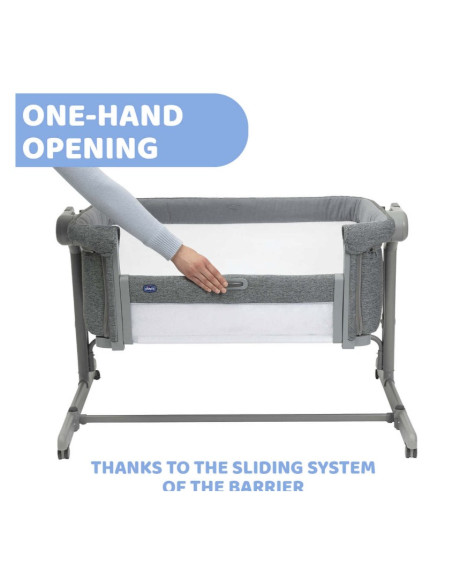OUVERTURE À UNE MAIN : Le berceau Next2Me Magic Evo dispose d'un système d'ouverture rapide et facile. La barrière coulissante s'ouvre et se ferme en appuyant sur un seul bouton, même lorsque le berceau est fixé au lit, ce qui le rend pratique à utiliser à tout moment.