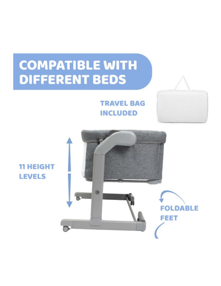 COMPATIBLE AVEC DIFFÉRENTS LITS : Le Chicco Next2Me Magic Evo est équipé de 11 niveaux de hauteur pour s'adapter à différents types de lits. Les pieds peuvent être pliés pour s'adapter aux lits à tiroirs.