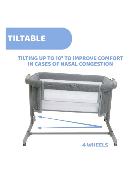 INCLINABLE JUSQU'À 10° : Le berceau peut être incliné jusqu'à 10°, avec un maximum de 4 positions entre une jambe et l'autre, pour améliorer le confort en cas de congestion nasale.
