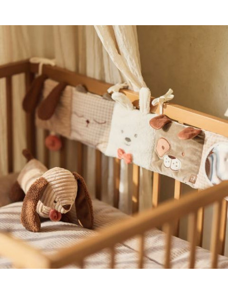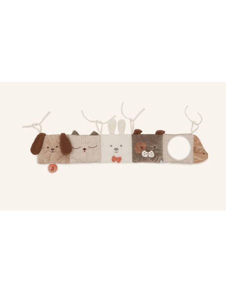 Ce jouet activité offre plein de possibilités de jeu : des petits miroirs pour éveiller la curiosité, des clochettes pour stimuler l’ouïe, du papier froissé pour explorer, et des tissus tout doux à câliner. Grâce aux cordons, il se fixe facilement au parc. C’est un cadeau de naissance idéal !