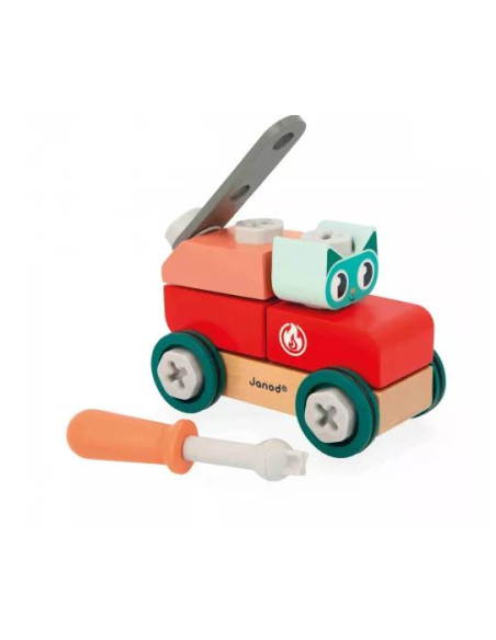 Petit chat débarque sur le chantier ! Cette voiture à construire en bois invite les enfants à partir de 2 ans à développer leur imagination et leur motricité fine en assemblant les pièces, pour ensuite faire la course ! Ce jeu de construction est composé de 10 pièces en bois et de 18 éléments de visserie en plastique (vis, écrous, inserts). Un tournevis est également inclus, ainsi qu'une carte modèle pour accompagner les bricoleurs en herbe dans l'assemblage du véhicule. Les vis sont crantées pour encore mieux imiter les vraies et permettre une manipulation facile par les enfants. Quel régal de pouvoir bricoler comme les grands ! Un jeu de bricolage est idéal pour les aider à développer leur motricité fine, leur dextérité et leur précision ! Et une fois la voiture construite, celle-ci est prête à prendre la route ! À bord de sa voiture jouet rouge et verte, notre fidèle félin viendra-t-il sur le chantier de construction pour une petite visite, ou fera-t-il la course avec ses amis ? De folles histoires s'offrent à votre enfant avec cette voiture à construire.