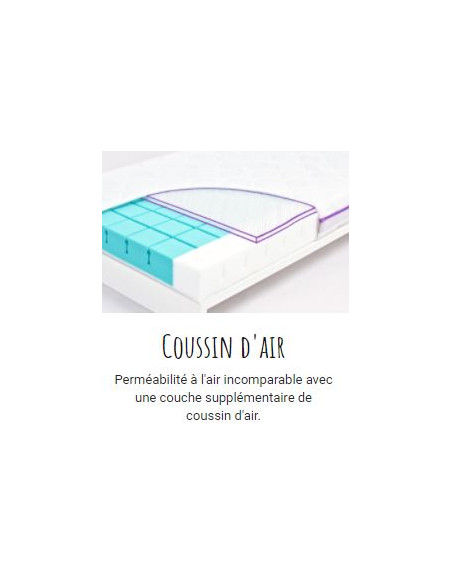 Ce matelas à ventilation renforcée et certifié TUV (sans émanations toxiques) contient des pads 3D ronds pour un meilleur confort et soutien du dos. Avec une face adaptée pour les nouveau né et une face pour les enfants de plus de 12 mois. Un coussin d'air 3D coté bébé pour encore plus de sécurité. Contribution recyclage incluse.