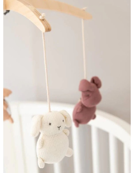Rendez l'heure du coucher magique avec le mobile musical en bois naturel de Bamboom auquel sont suspendus d'adorables animaux en tricot.