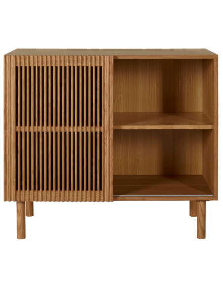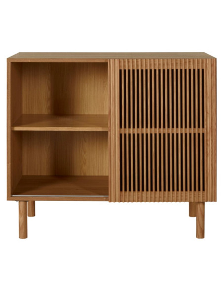 Les pieds et les barreaux de la porte sont en frêne massif. Les côtés terminaux, le top, le fond et l’étagère sont en panneau MDF plaqué.