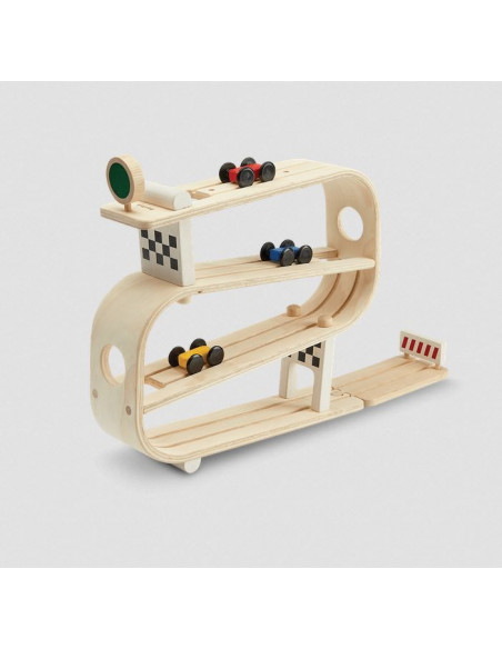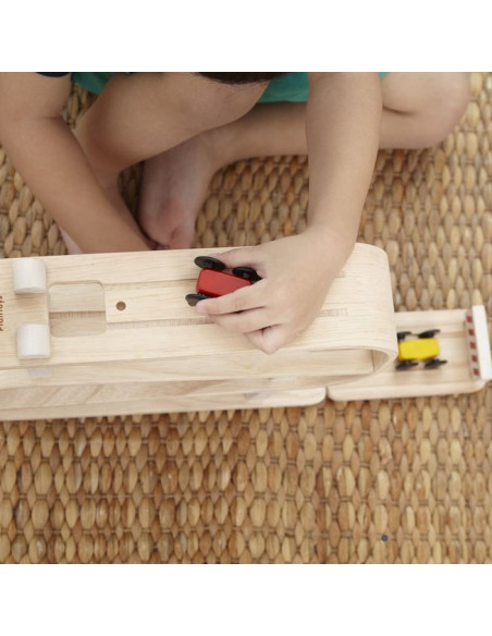 Trois voitures défilent à toute allure sur ce circuit en bois naturel de la marque Plan Toys! Pour enfant dès 18 mois.