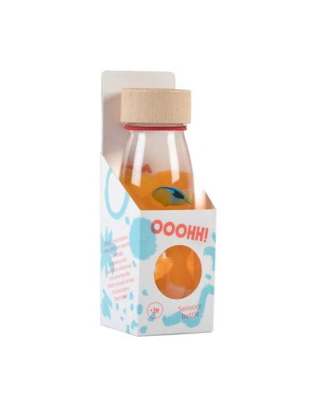 Bouteille sensorielle sonore et bulles oranges avec poisson chirurgien bleu. Permet de découvrir les couleurs, développer la curiosité, s'émerveiller avec la lumière, stimuler la concentration et trouver son moment de calme.
