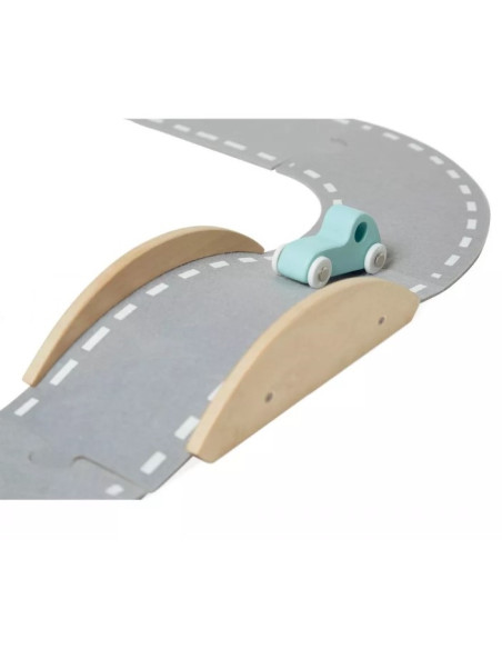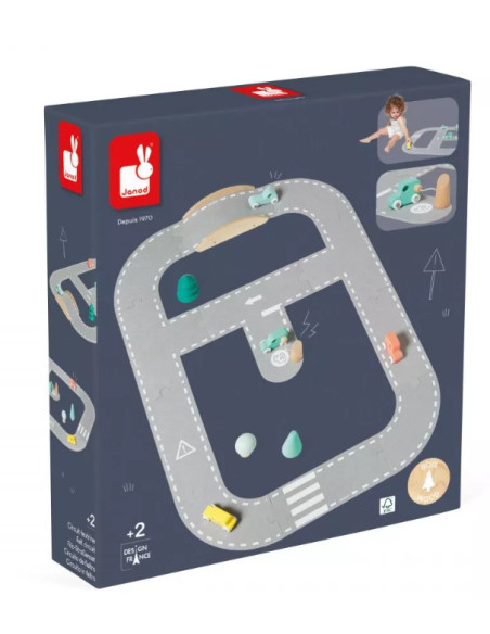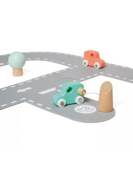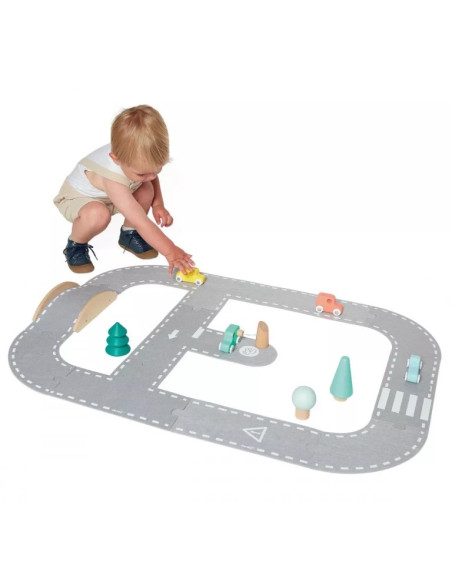 Un jeu de construction composé de 12 pièces avec un circuit tout doux à assembler et accompagné de 9 accessoires en bois pour animer les histoires de votre enfant :