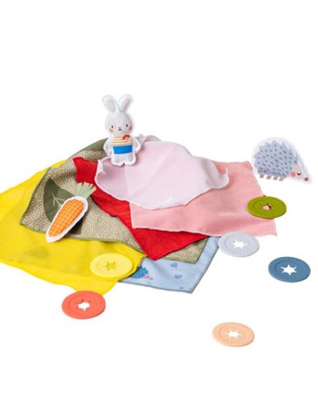 Quand il les découvre enfin, il s’émerveille et se familiarise avec la relation de cause à effet ! Ce jeu de cache-cache Taf Toys est complété par six carrés de tissus de couleurs et de matières différentes pour mettre en éveil les sens de bébé.