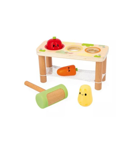 Ce jouet premier âge se compose d’un support en bois avec filet, de 3 légumes en bois (tomate, pomme de terre et carotte) et d’un marteau en bois avec sa coque en silicone.