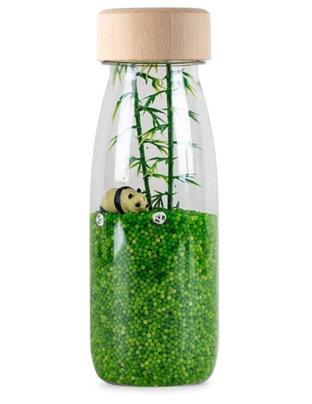 Bouteille sensorielle sonore où un Arbre et des pandas sont cachés parmi des grains Vert .