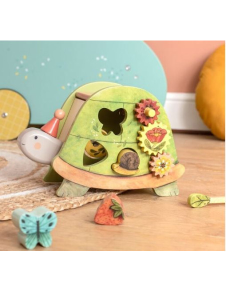 Cette adorable tortue en bois offre 4 faces riches en découvertes de jeux et d'apprentissages. Votre tout-petit pourra s'amuser avec des formes à encastrer, des roues dentées à faire tourner, un xylophone...