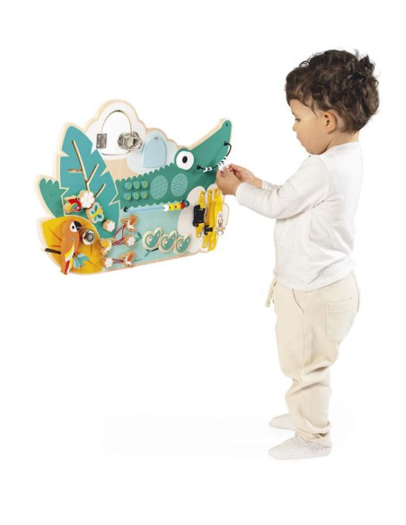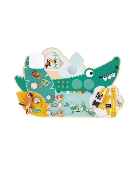 Un busy-board tout droit sortie de la jungle pour la chambre de bébé ! Idéale pour divertir et stimuler les petits, dès 18 mois, cette planche d’activités en forme de crocodile propose une multitude de jeux à manipuler. Au total, plus de 14 jeux d’éveil sont répartis sur ce panneau d’activités, pour favoriser le développement de la motricité et de la dextérité des enfants. Au programme des réjouissances : 1 labyrinthe avec 3 éléments à manipuler, 1 œil rotatif sonore, 3 sangles avec différents systèmes de fermeture (fermeture éclair, scratch, plastique), 3 engrenages caméléons, 1 sonnette, 1 serrure métallique, 1 miroir caché, 1 boulier avec des billes colorées, des textures en silicone et en feutrine à toucher, des boutons à pousser, des élastiques à attacher … Vous l’aurez compris, ce sont des heures de découvertes qui s’offrent aux petits curieux ! Que de plaisirs tactiles et sonores au service de la motricité fine de bébé. Et des ouvertures diverses et accessibles, pratiques pour s’entrainer à s’habiller. C’est un jouet d’éveil polyvalent, complet et parfait pour des moments de jeu autonomes. Vous pouvez facilement fixer le busyboard en bois au mur. Il saura trouver sa place dans une chambre d’enfant, grâce à son style tropical et ses couleurs vives. Bébé retrouvera tous les animaux stars de la jungle : toucan, perroquets, singe … Et le crocodile, bien sûr ! Dimensions : 57 x 36,5 cm. Issu de notre collection de jouets d’éveil en bois Tropik, ce busy-board crocodile est composée de bois certifié FSC™. Croco n’attend plus que vous !