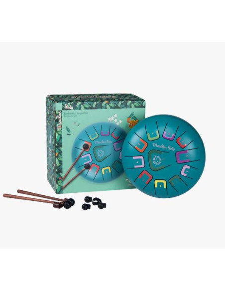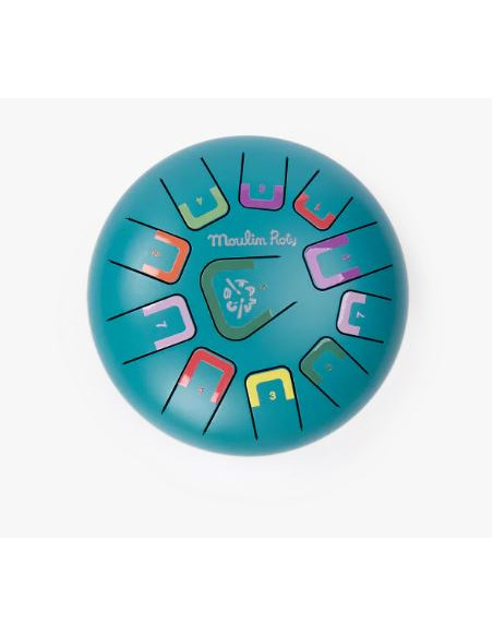 Ce tambour à languettes dispose de 11 notes indiquées par une couleur et un chiffre. Il y a différentes façons de jouer : avec le bout des doigts, les mains ou à l'aide des baguettes incluses.