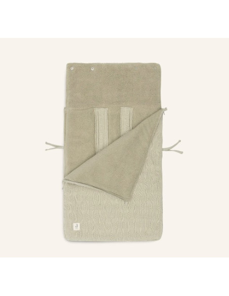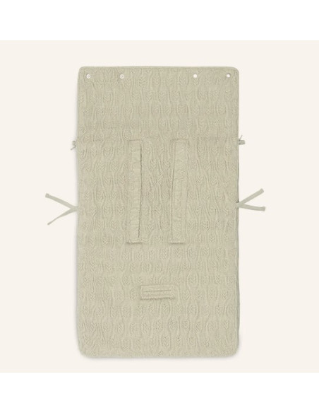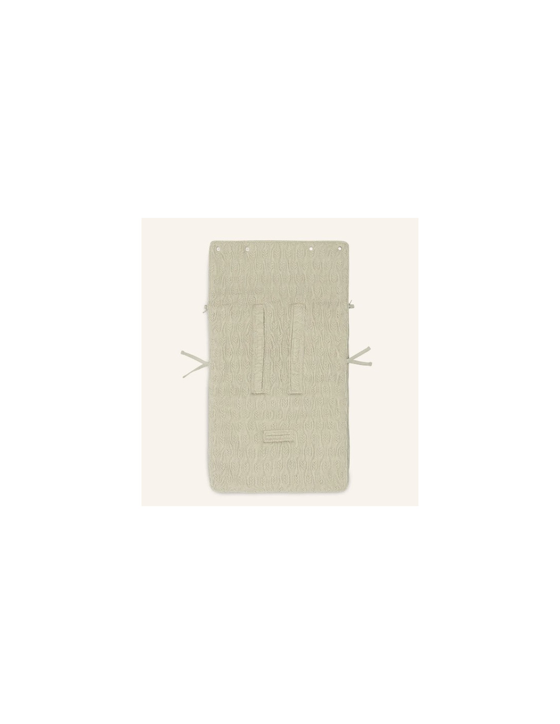 Cette chancelière en tricot de Jollein est rembourée et a un intérieur en polaire. Elle convient pour une utilisation avec ceinture de siège 3 ou 5 points. Une capuche peut être créée par le haut simplement avec les boutons pressions.