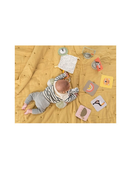 Livré avec un guide qui fournit des conseils sur le développement du nouveau-né et explique l'utilisation de chaque jouet.