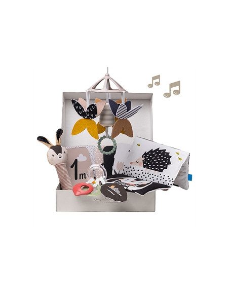 Coffret de jouets pour nouveau-né en noir et blanc.
