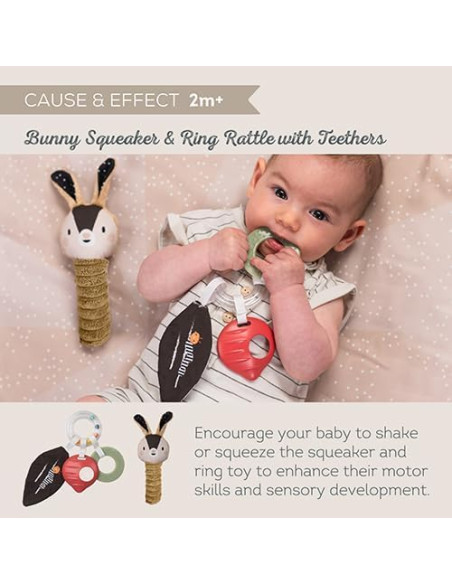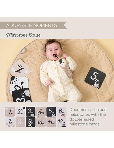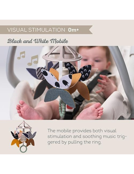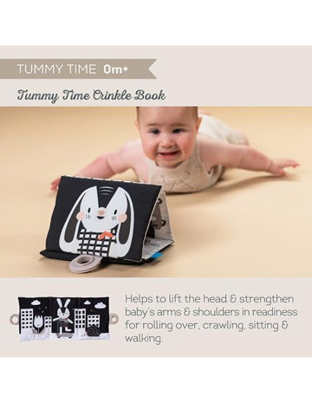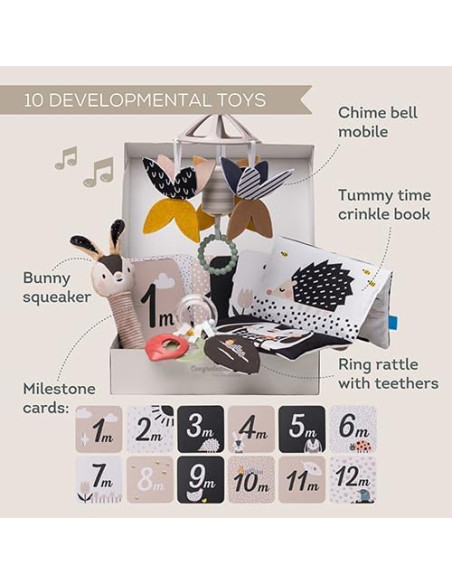 Stimulez le développement visuel de votre bébé avec ces jouets noirs et blancs, spécialement conçus pour soutenir la vue des nouveau-nés. Contient 10 jouets d'éveil ! Stimulez les moments passés sur le ventre avec le livre froissé noir et blanc pour une stimulation sensorielle, stimulez les sens visuels et auditifs avec le mobile à grelots et développez la motricité avec le hochet anneau. Utilisez le couineur en forme de lapin pour une stimulation sensorielle supplémentaire. Notez les étapes importantes de votre développement grâce aux cartes recto-verso.