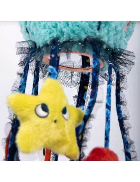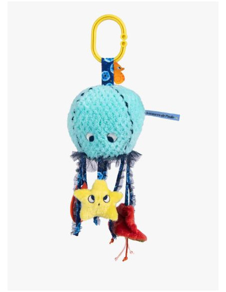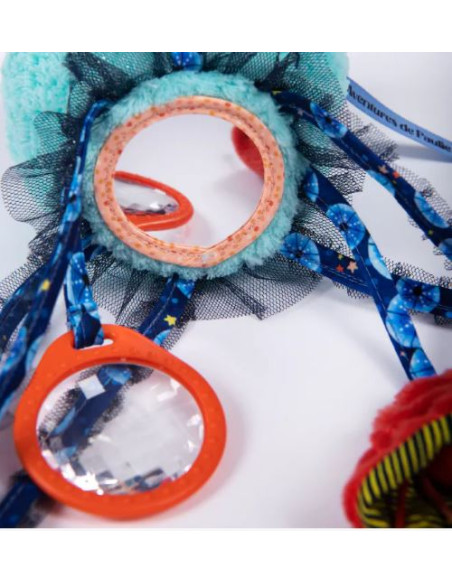 Parmi les algues dansantes, se trouve une jolie méduse aux couleurs irisées qui peut être câlinée ou accrochée. Cette petite créature tendre, aux matières moelleuses est remplie d'activités : prisme, miroir, grelot, dilling et étiquettes à saisir.