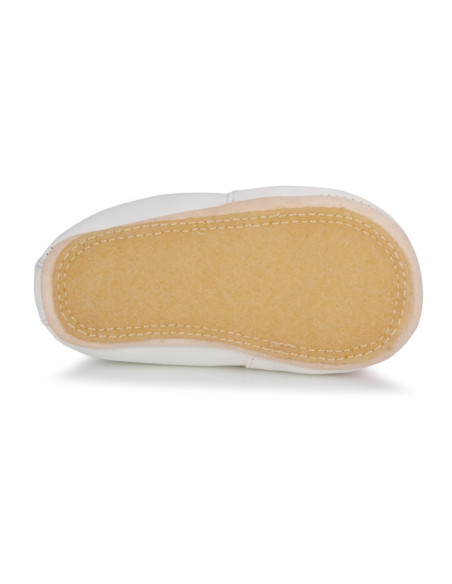 Chausson en cuir pour bébé, idéal pour finir les petites tenues, tiens bien à la cheville et permet d'éviter les pieds nus... Cette vesrion comprend également un patin souple anti dérapant facilitant l'apprentissage de la marche.