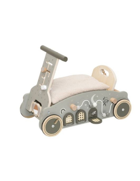 Le bois, la douce couleur vert et les touches naturelles de ce jouet en font un ajout élégant à toute salle de jeux. Des éléments interactifs comme des engrenages, des perles et des curseurs sont intégrés sur les côtés pour stimuler la motricité. Grâce à ses roues en caoutchouc silencieuses et anti-rayures, la poussette est parfaite pour une utilisation en intérieur comme en extérieur.
