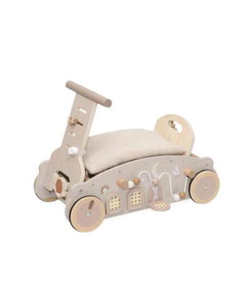 Le bois, la douce couleur vert et les touches naturelles de ce jouet en font un ajout élégant à toute salle de jeux. Des éléments interactifs comme des engrenages, des perles et des curseurs sont intégrés sur les côtés pour stimuler la motricité. Grâce à ses roues en caoutchouc silencieuses et anti-rayures, la poussette est parfaite pour une utilisation en intérieur comme en extérieur.