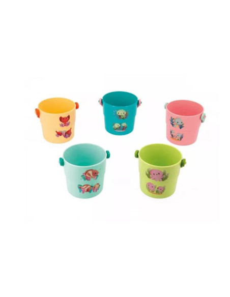 Voici un incontournable jeu de bain, les seaux percés ! Ces 5 seaux aux belles couleurs et aux jolies illustrations d'animaux marins feront bien rire bébé ! On remplit les seaux d'eau puis on s'amuse à la voir s'échapper par le dessous et à observer les seaux se vider. Les trous sous les seaux sont tous différents, les enfants pourront donc faire tout un tas d'expériences et pourquoi pas comparer les débits ! Faciles à soulever, empilables et adaptés aux mains des plus petits, ils feront le bonheur de vos petits poissons. A l'arrière des seaux, on retrouve des chiffres, permettant une activité différente dans le bain ! Ce jouet pour le bain peut être proposé aux enfants dès 10 mois.