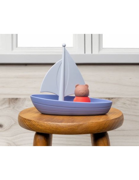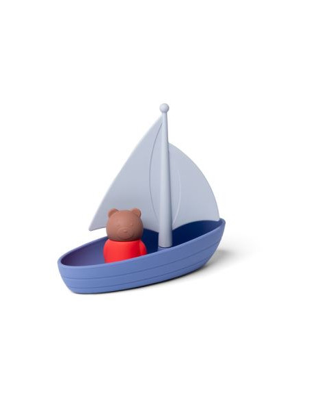 Un adorable ours navigue sur son bateau aux couleurs vives – bleu, rouge et marron.