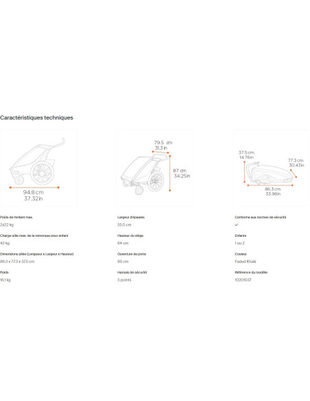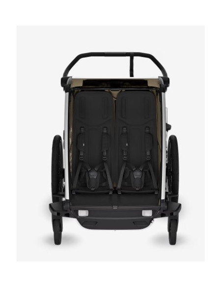 Avec l'assise modulaire, vous pouvez choisir d’avoir un enfant assis au milieu ou deux enfants de chaque côté de la remorque. Sièges entièrement rembourrés et inclinables d’une seule main pour les siestes.