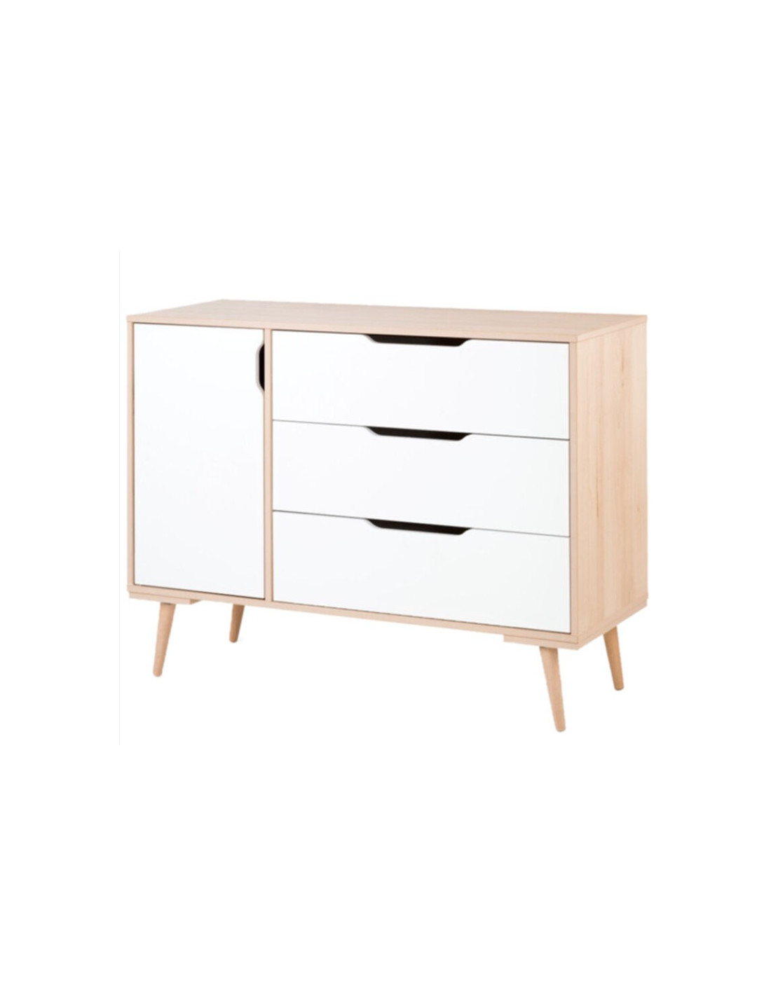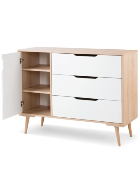 Atout charme et élégance pour cette commode de style scandinave, qui associe la blancheur au bois naturel.