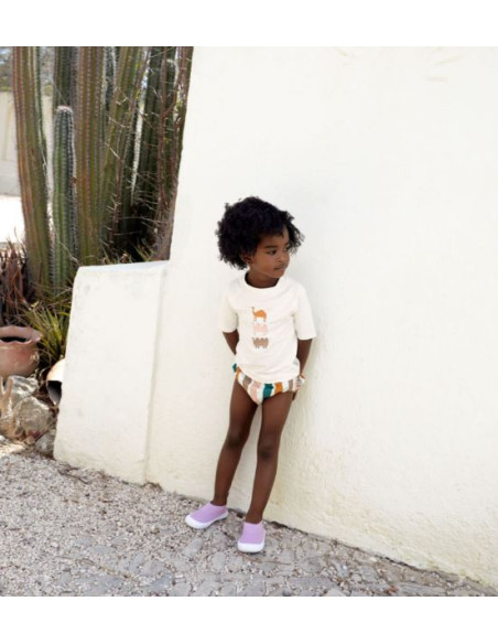 Le T-shirt anti-UV manches courtes pour enfants et bébés, composé à 82% de polyester (recyclé) et de 18% d’élasthanne, permet de profiter pleinement du plaisir de la baignade grâce à son indice de protection UV de 60 et de ses imprimés fantaisie.