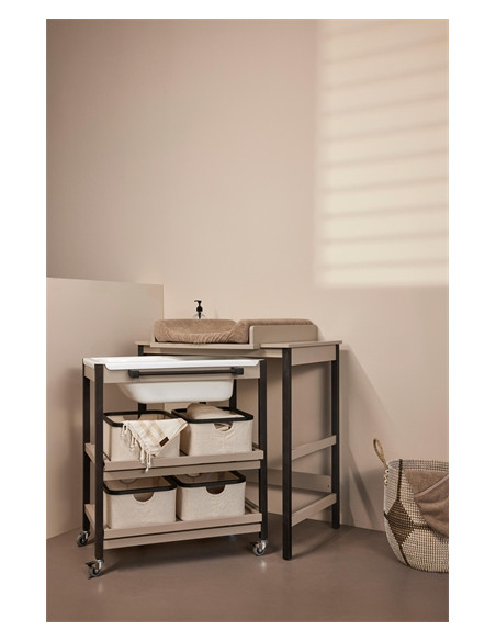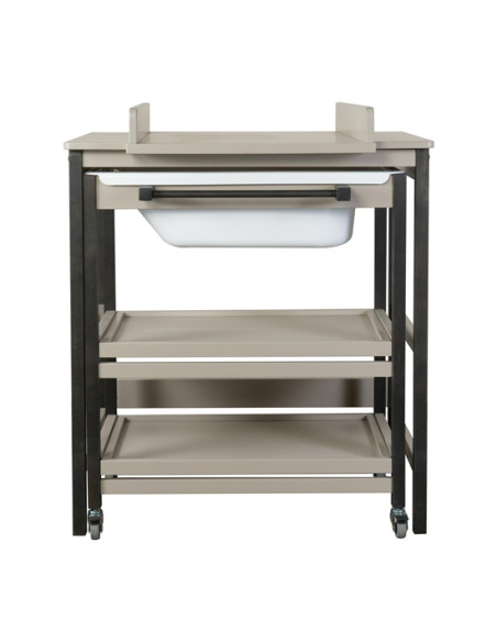 Meuble de bain avec baignoire rigide, tuyau de vidange et table à langer. Emboitage pour économiser de l'espace après utilisation.