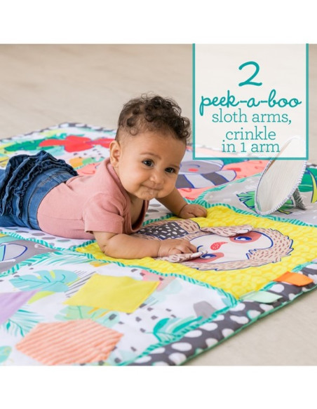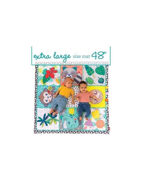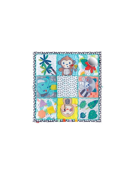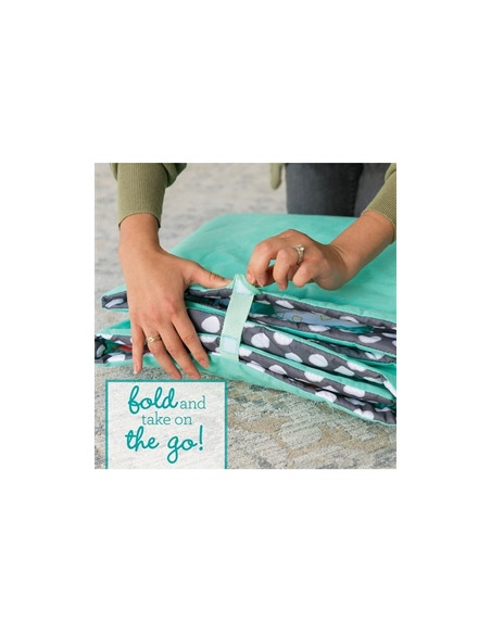 Tapis large facile à plier pour les déplacements et le rangement. Sensations visuelles, sonores et tactiles avec un large miroir pour faire coucou lors des temps de jeu sur le ventre.