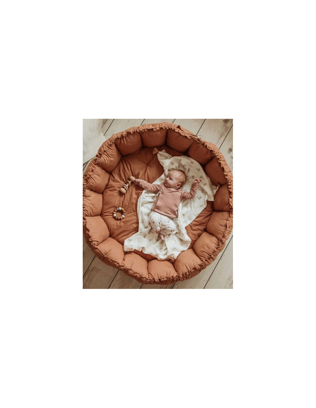 Composition :100% coton organique. Dimensions du tapis de jeux : L. 130 x l. 130 cm Dimensions de l'aire de jeux : L. 76 x l. 76 x H. 27 cm