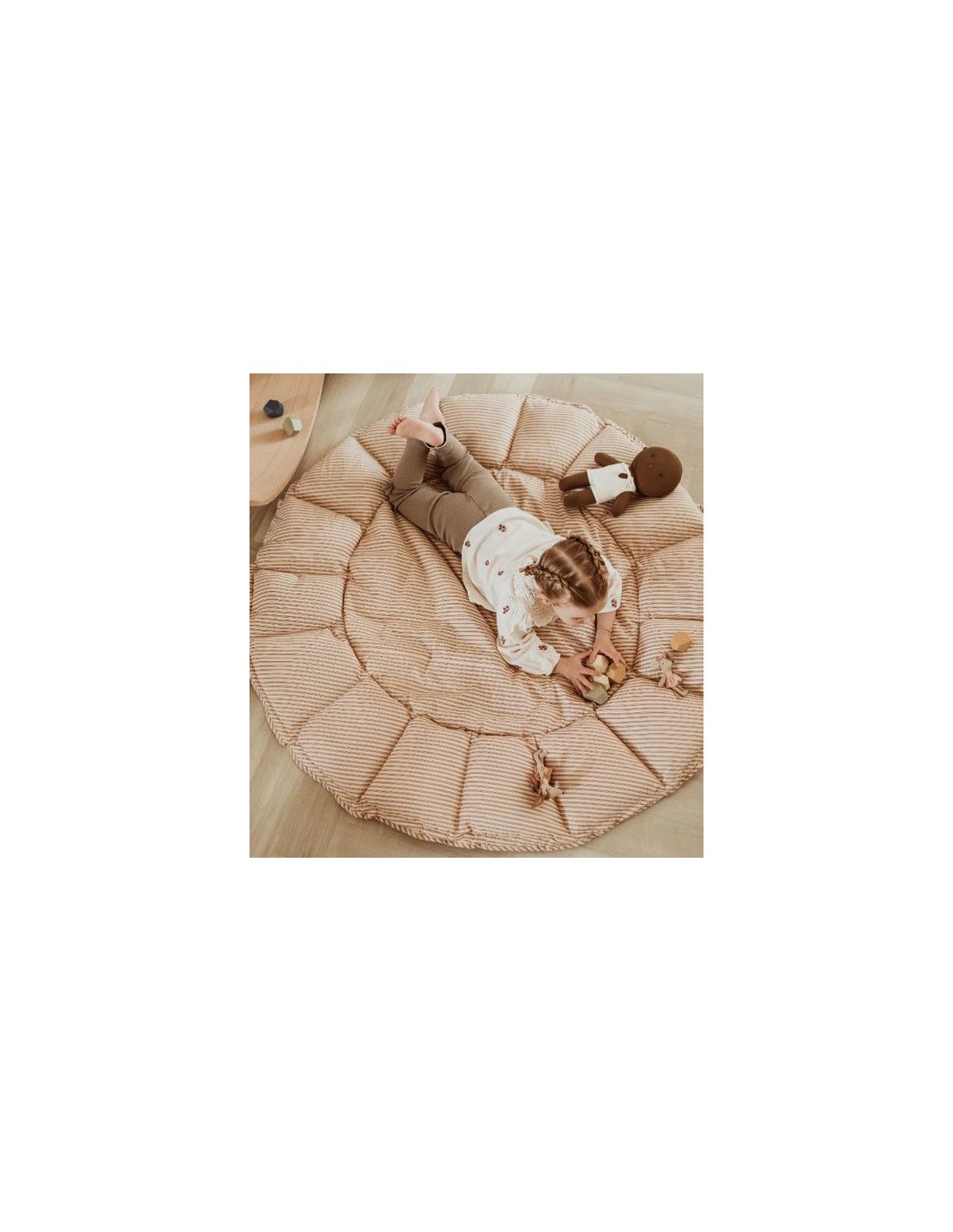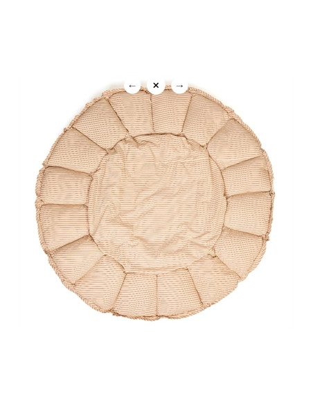 Simple d'utilisation, pour passer du mode tapis de jeux au mode aire de jeux, il suffira de soulever les pétales en tirant doucement sur les cordes puis de placer ces dernières à l'intérieur de la poche.