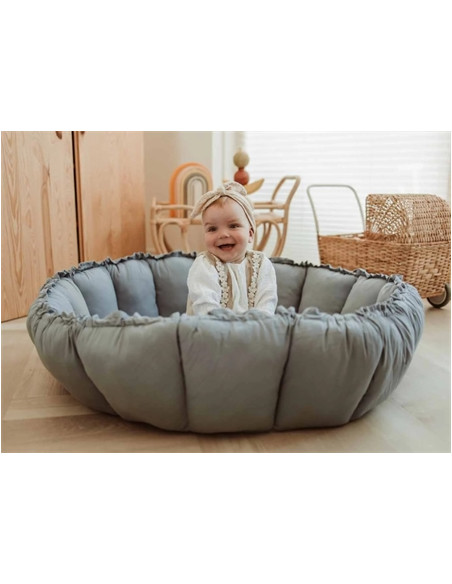 Simple d'utilisation, pour passer du mode tapis de jeux au mode aire de jeux, il suffira de soulever les pétales en tirant doucement sur les cordes puis de placer ces dernières à l'intérieur de la poche.