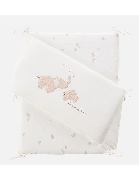 Le tour de lit avec housse déhoussable se fixe aux barreaux grâce à des liens en tissu.