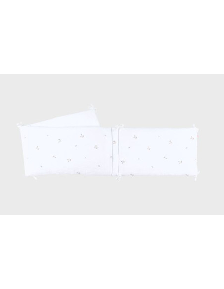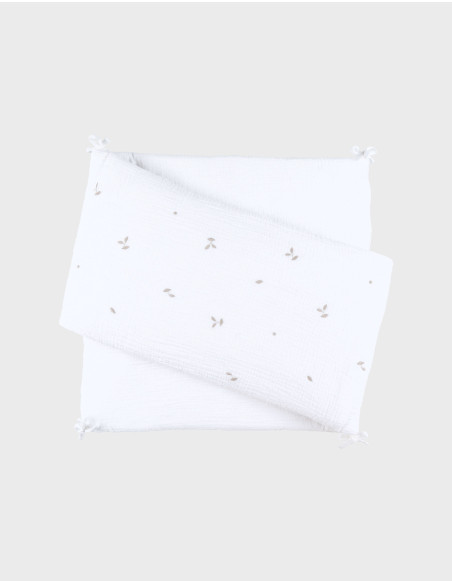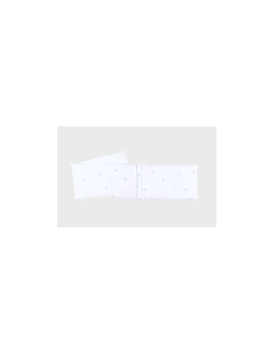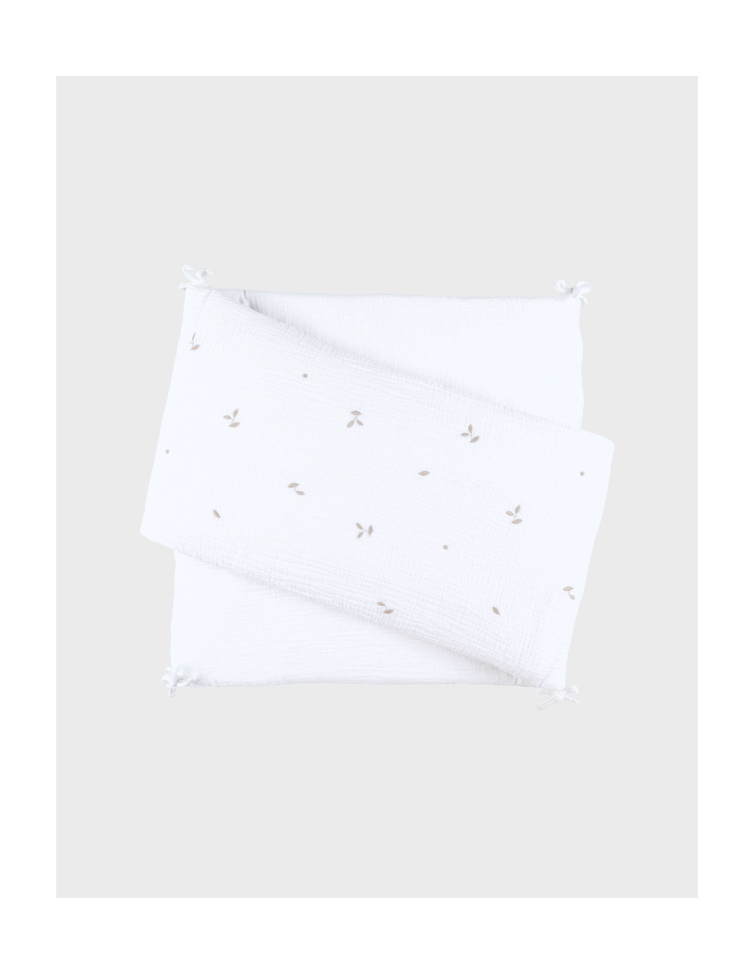 Ce tour de lit réversible en gaze de coton BIO blanche, décoré de broderies discrètes inspirées de la nature, crée une ambiance sereine et apaisante dans la chambre de bébé. Avec ses teintes neutres et intemporelles, il convient aussi bien aux petites filles qu’aux petits garçons, et s’intègre harmonieusement à tous les styles de décoration.