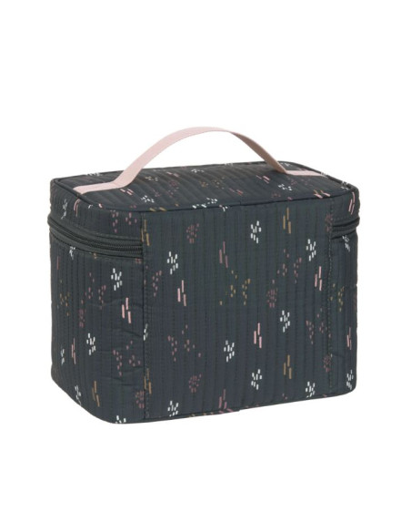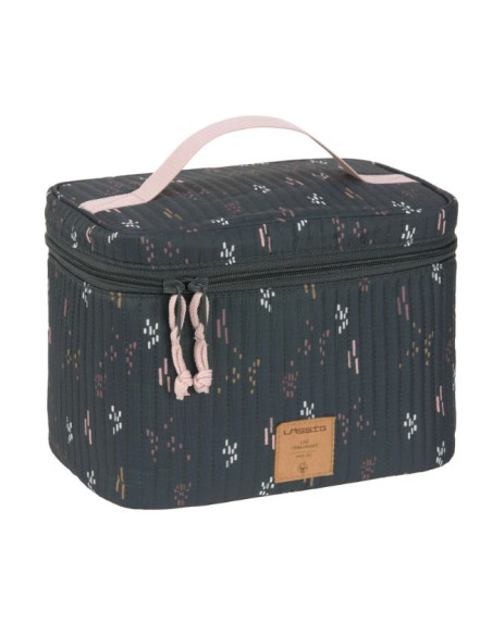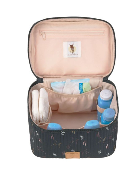 Les produits pour la toilette bébé se rangent facilement dans le compartiment principal comprenant des poches latérales et des liens élastiques, et les petits objets comme les chaussettes, les tétines, etc…peuvent se ranger dans le compartiment zippé du rabat.