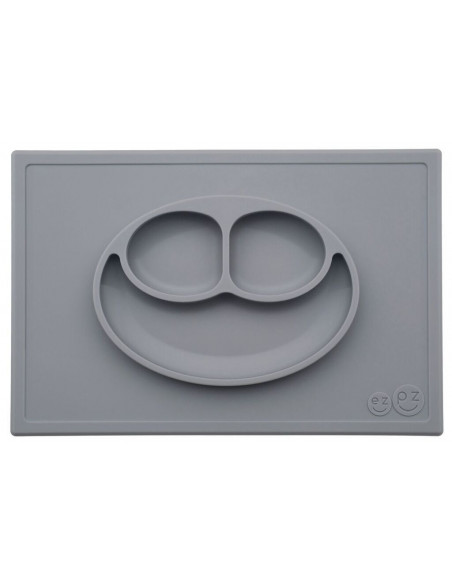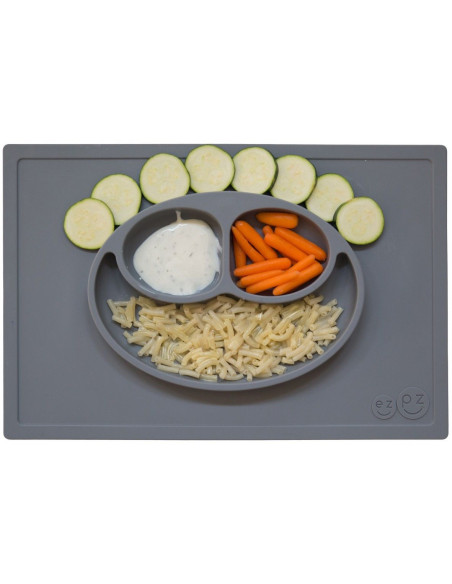 Un set de table et une assiette, tout-en-un, en silicone de grande qualité. Il adhère directement à la table ou à la tablette des chaises hautes, ce qui le rend presque impossible à retirer par des petites mains.
